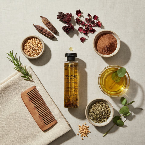 Unlock the power of nature with our Advanced Methi Hair Oil, expertly crafted to address your most pressing hair concerns. This luxurious blend features organic methi (fenugreek), a time-honored ingredient celebrated for its incredible methi seeds benefits for hair. We've combined methi to hair with the enriching properties of hibiscus and rosemary to create a holistic solution for comprehensive hair care.